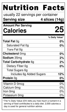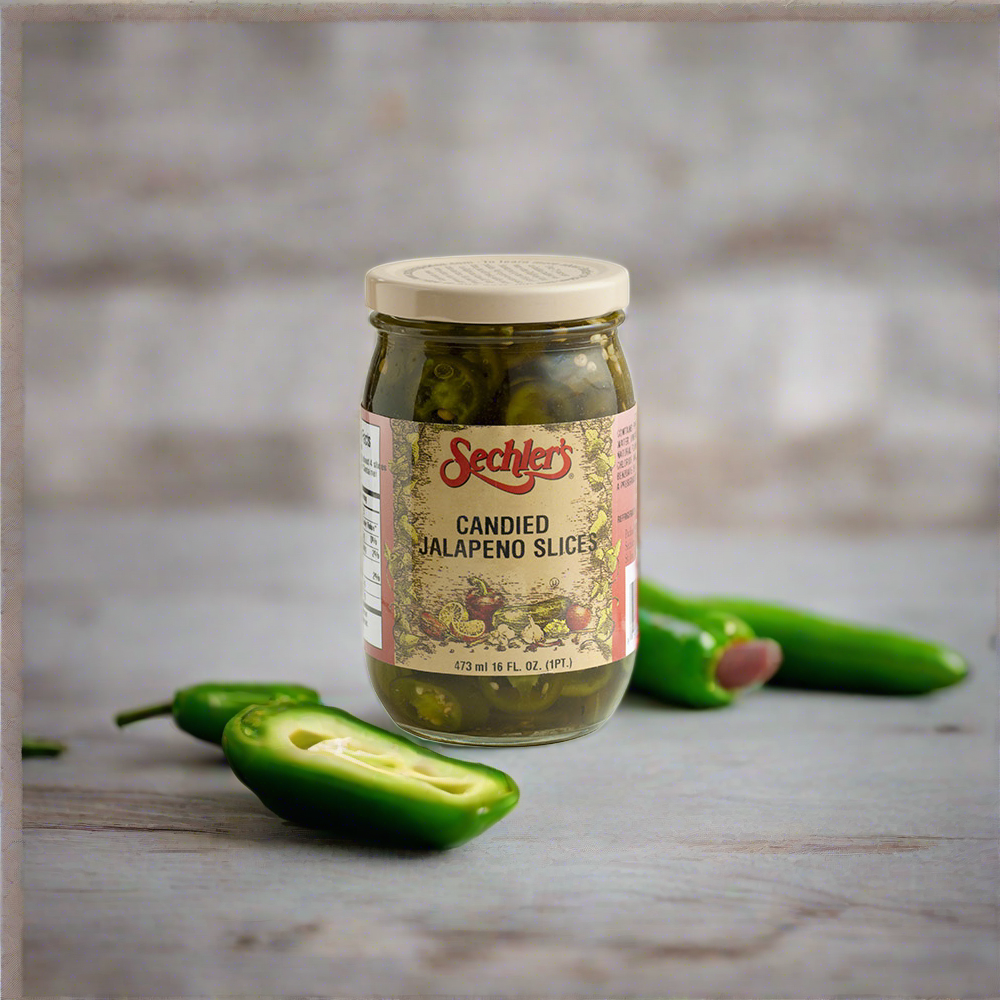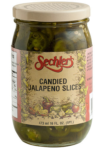 16 ounce Candied Jalapeno Slices are thinly sliced pickled jalapenos sweetened twice with pure sugar.