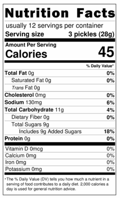 Ingredients: Cucumbers, Sugar, Water, Vinegar, Salt, Natural & Artificial Flavors, Alum, Turmeric and 1/10 of 1% Benzoate of Soda Added as a Preservative.