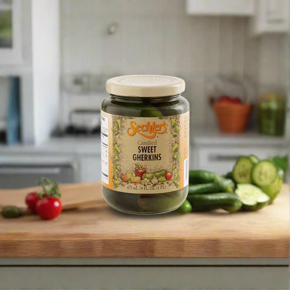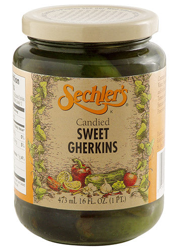 16 ounce Candied Gherkins are small whole pickles that are sweetened twice for a flavor infusion throughout the entire pickle.
